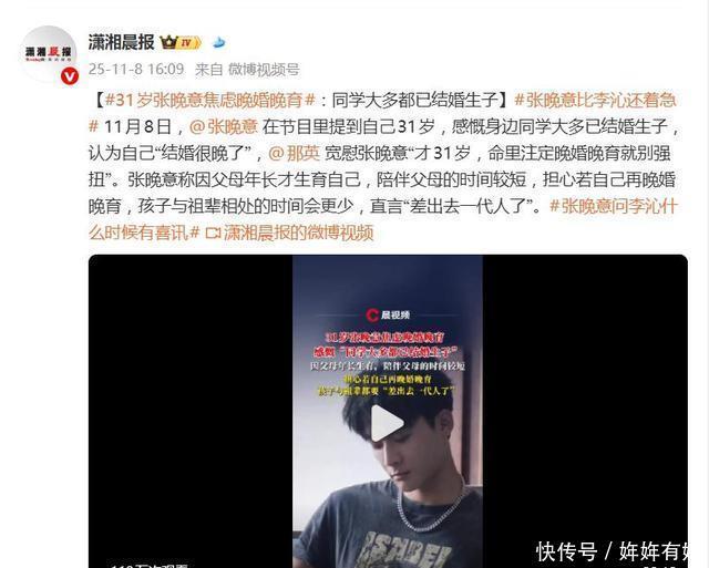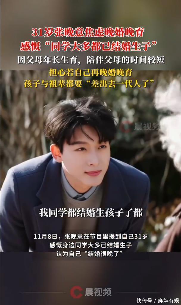 日报道,演员张晚意在节目里一句关于“结婚很晚了”的感慨,意外戳中了不少同龄人的心窝子。31岁的他坦言身边同学大多已步入婚姻、生儿育女,对比之下,自觉“进度落后”,还因父母年长生育自己、陪伴时间有限,担心若再晚育,下一代和祖辈的相处时间会更短,直言“差出去一代人了”。